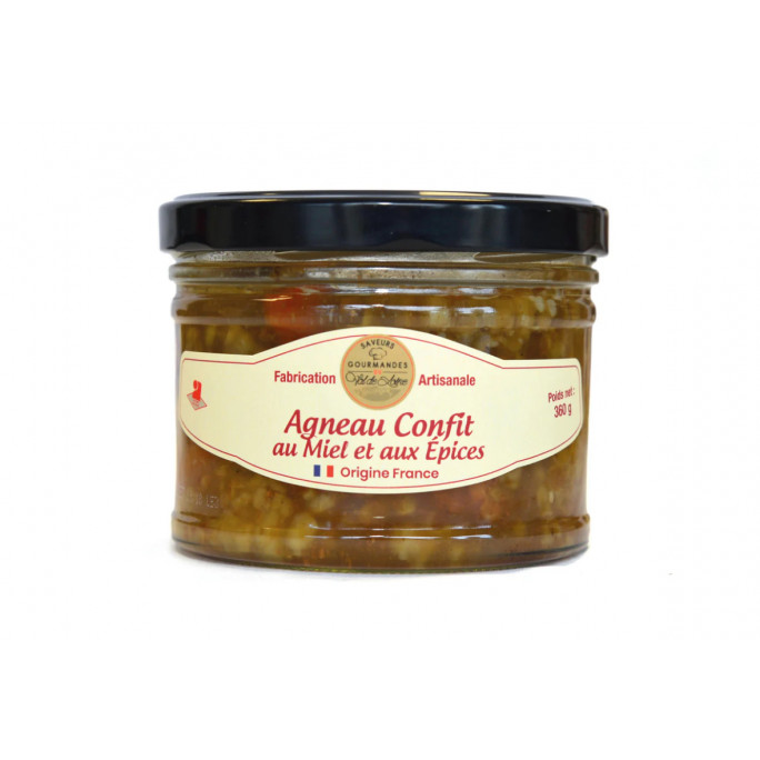 Viande d’agneau ((40%) ORIGINE FRANCE), eau, carottes, oignons, fécule de pomme de terre, miel de Touraine (3%), boulgour (Blé), sel, poivre, épices (<1%).
